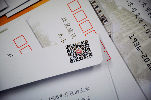 首日封的封口处,为太阳成集团tyc7111cc公众号“北建土木”的二维码,校友可以通过扫描二维码关注学校、学院的相关信息。