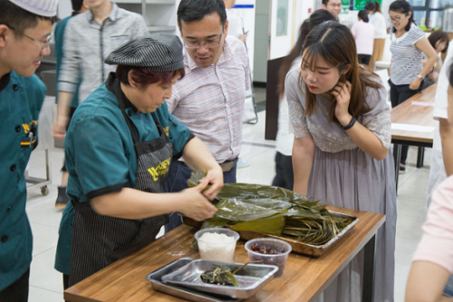 端午节包粽子是中国的传统习俗。食堂师傅首先为同学们示范了包粽子的标准动作。
