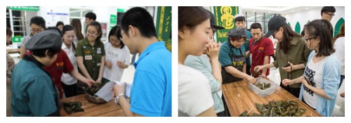 所有参与活动的同学学会了包粽子的技巧,并按小组开始包粽子比赛。同学们按照师傅刚刚演示的手法,从生疏到熟练,漂亮的粽子一个一个从他们的手中呈现出来。