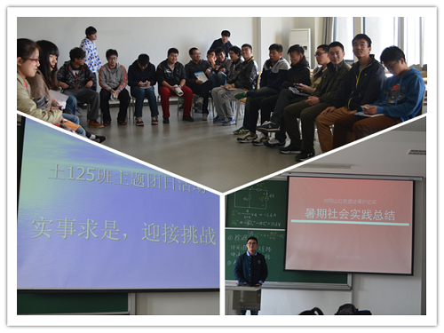 大学生暑期社会实践成果宣讲将土124班的活动推向高潮。“探访承德围场民族乡,关注留守儿童教育行”--一个简短有力的视频让大家意识到我们现在是如此的幸福,一定要珍惜这来之不易的幸福生活,并在自己的能力范围内尽可能地多帮助那些条件依旧艰苦的家庭和留守的孩子。学会知足和感恩,给人关怀和帮助也是我们践行社会主义核心价值观中不可或缺的一部分。在“学业大讨论”环节,班内每个人都说出了自己心中的目标以及对毕业后的规划。哪怕每天只是前进那么一小步,点滴的积累也会对一个人的学习习惯,知识积累产生不可估量的作用。