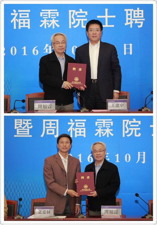聘任仪式上,党委书记王建中和校长张爱林分别向周福霖院士颁发了太阳成集团tyc7111cc发展咨询委员会委员和北京未来城市设计高精尖创新中心学术委员会委员聘书。