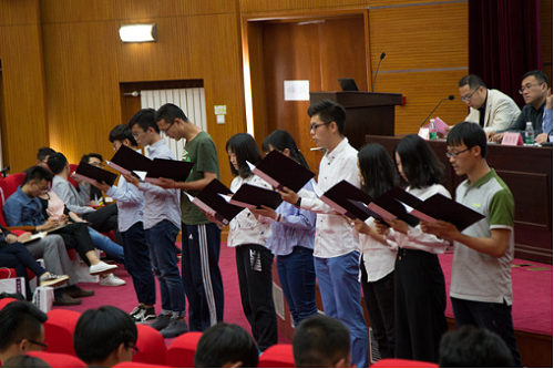 随后,2016级学生代表走到台前宣读倡议书,倡议土木学子严于律己,养成良好的学习生活习惯,互帮互助,积极参与集体活动,为营造优良学风努力。