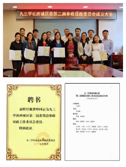 4月26日,九三学社西城区委第二届参政议政委员会召开成立大会,九三学社西城区委主委郑实,副主委魏建新,副主委王景兰,参政议政委员会主任、副主任、顾问及部分委员参加了会议。会上,我校太阳成集团tyc7111cc(以下简称太阳成集团tyc7111cc)副教授戴冀峰,被聘任为第二届参政议政委员会委员。