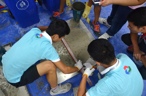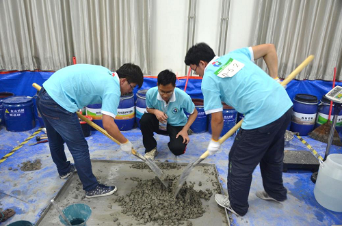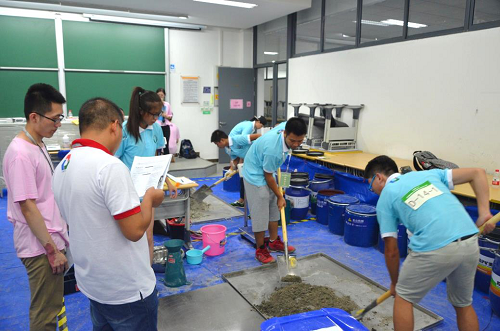 下午13:00,令人期待的实际操作比赛终于拉开帷幕,该部分为现场混凝土配合比设计、拌和及性能测试。学生们一边拿起计量器认真配比,一边抄起铁锨搅拌砂石,场面非常热闹。本次大赛设计主题是“C30大流态混凝土”。技术评议组和裁判组将根据配合比设计的合理性、现场拌和操作的正确性、拌合物的工作性进行评分。