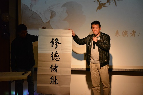 要说晚会最具创意的节目,还数李鹏飞和王剑烨带来的《琴韵墨香》,新颖的表现形式令观众耳目一新。李鹏飞现场挥毫泼墨,笔势雄健洒脱,挥笔书写下“风华正茂”四个大字,王剑烨伴以古筝弹奏,行云流水,飘逸如风,古典音乐的魅力将现场观众仿佛带入了如痴如醉的梦境。党总支书记何立新书法造诣颇深,在主持人和观众的热情邀请下登台,创作“修德储能”,他说在研究生阶段开始新的起点,先要学做人、笃实修德,再研究搞学问,为国为家实现自身的价值。