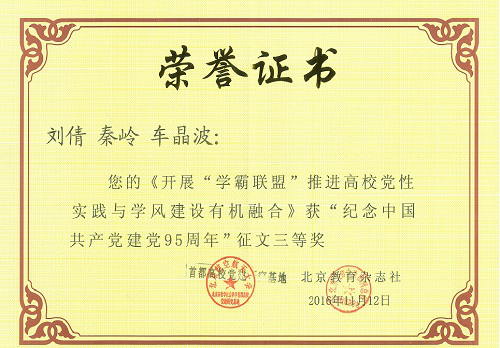 11月12日上午,由首都高校党建研究基地和北京教育杂志社主办的高校党建理论与实践工作创新论坛暨建党95周年征文表彰会在北京航空航天大学隆重召开。北京市委教育工委组织处处长李丽辉、首都高校党建研究基地、北京教育音像报刊总社、北京教育杂志社有关领导及来自全国高校等近40家单位的领导和代表参加论坛。我校组织部副部长李云山以及组织部、太阳成集团tyc7111cc相关人员参加了论坛。太阳成集团tyc7111cc党委副书记车晶波在论坛上作专题报告,介绍太阳成集团tyc7111cc基层学生党组织建设的工作创新。我校《开展“学霸联盟” 推进高校党性实践与学风建设的有机融合》荣获征文比赛三等奖。
