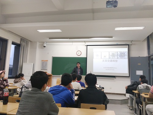 讲座开始后,张喆宁老师向学生们简述了北京市交通的概况,他从老北京城延续的城市规划讲起,谈起北京市交通的框架的来龙去脉。在解释完基础性的信息之后,张老师为学生们介绍了交通模拟软件VISSIM和由此模拟出的北京市的交通模型。他在进行数据分析后,为学生从交通供给,社会经济数据库和出行行为三方面介绍了北京市交通模型。用大数据来分析问题,又举出小实例,用通俗易懂的例子深入浅出的为同学们介绍交通模型,给在座的许多同学都带来了启发。之后,他着重介绍了对人流的分析,分析交通一定要注意人流,这是一个很微妙的数据,看似无迹可寻,其实往往有隐藏起来的规律,这可能跟心理学还有的关系。人流是交通的主导,这也是为什么北京会有早晚高峰的原因。