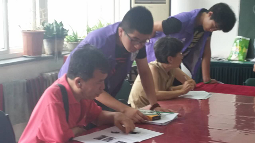 学生志愿者根据口述帮助残疾人士填写问卷