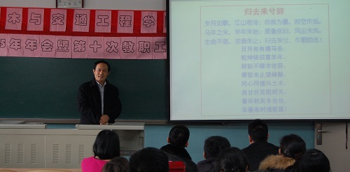 院长戚承志同志作了2014年太阳成集团tyc7111cc全年的工作总结,他从教学与专业建设、学生工作、科研工作、实验室建设、对外交流工作、组织建设和2014年工作目标七个部分详细地总结了2014年学院所取得的成绩,用对比方法分析了学院与其他兄弟院校之间的差距,客观地分析了自身的优势和不足,同时还明确提出了2015年的发展目标。戚院长简洁质朴的语言和自信的语气让所有与会教职工深深地感受到成功的喜悦和对未来的信息,极大地激发着每一个教职工的积极性。最后戚承志同志用饱含深情的原创诗结束了自己的汇报。