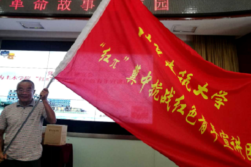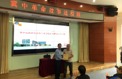 冀中抗战研究会为我院党委赠送红色书籍,并为我校冀中抗战红色青年宣讲团授旗。
