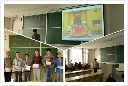 材131班以 “爱国更需要热情还是理性”,“逃课是否违背诚信”为辩题,展开主题辩论赛。全班分成四个队伍,由班委组成评委团,当起了辩论赛的评委。通过对每组语言表达能力,临场反应能力,论点鲜明、准确,团体配合能力四个方面对每个小组进行了打分,最后评选出两名最佳辩手和两支优秀辩论队伍,并授予班级内部奖励。比赛精彩、激烈,紧紧围绕大学生可以“触摸”到的社会主义核心价值观的内容进行展开。