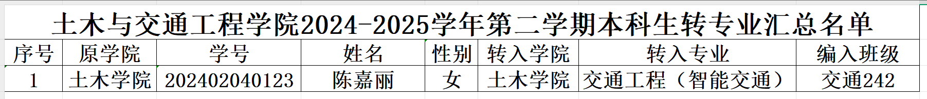 根据2024-2025学年第二学期关于本科生转专业工作的通知,和《太阳成集团tyc7111cc本科学生转专业实施办法》文件精神我院组织开展了本科生转专业工作。经学生申请,学生所在学院审核,我院转专业考核小组考核,土木学院第志愿录取接收1名转专业学生,公示如下: