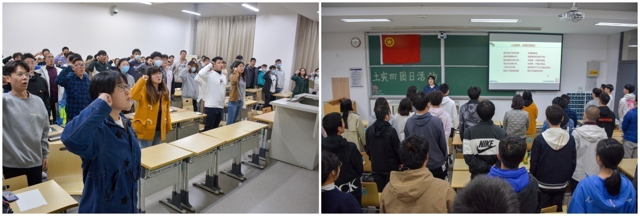 分享结束后,全体在场团员在团支书田甜的带领下对着团旗庄严宣誓,重温入团誓词并齐唱团歌。