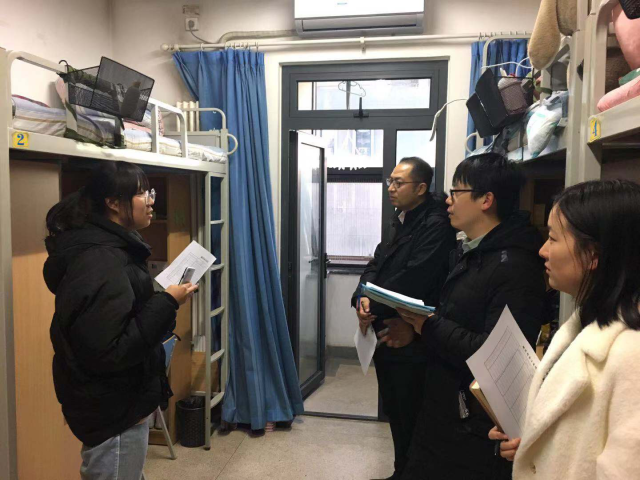 12月7日下午,太阳成集团tyc7111cc党委副书记车晶波带队,学院全体辅导员老师和15位同学代表组成的评分团进入各宿舍对宿舍文化建设等方面进行现场打分。每间宿舍都各具特色,有的宿舍门上挂有绿植作为装饰,有的挂着小黑板记录知识点,有的同学用墙纸海报装饰自己的空间。在对宿舍文化建设讲解这一环节中,土172班419宿舍长闫少佳说到,每周她们都有固定的集体活动,英语原声电影之夜,是她们四六级高通过率的秘籍,答题解惑之夜,帮助她们学习成绩名列前茅;材161班421宿舍长覃铃玲说到,宿舍成员都有各自擅长的运动项目,在体育锻炼中,培养了她们之间亲密无间的感情。