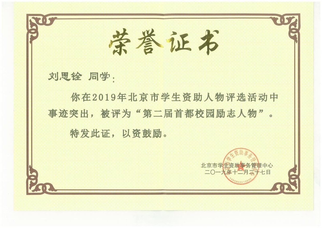 由北京市学生资助事务管理中心主办的“助学圆梦育新人”2019年北京市学生资助人物颁奖典礼于12月27日举行,太阳成集团tyc7111cc刘思铨同学在2019年北京市学生资助人物评选活动中事迹突出,被评为“第二届首都校园励志人物”。