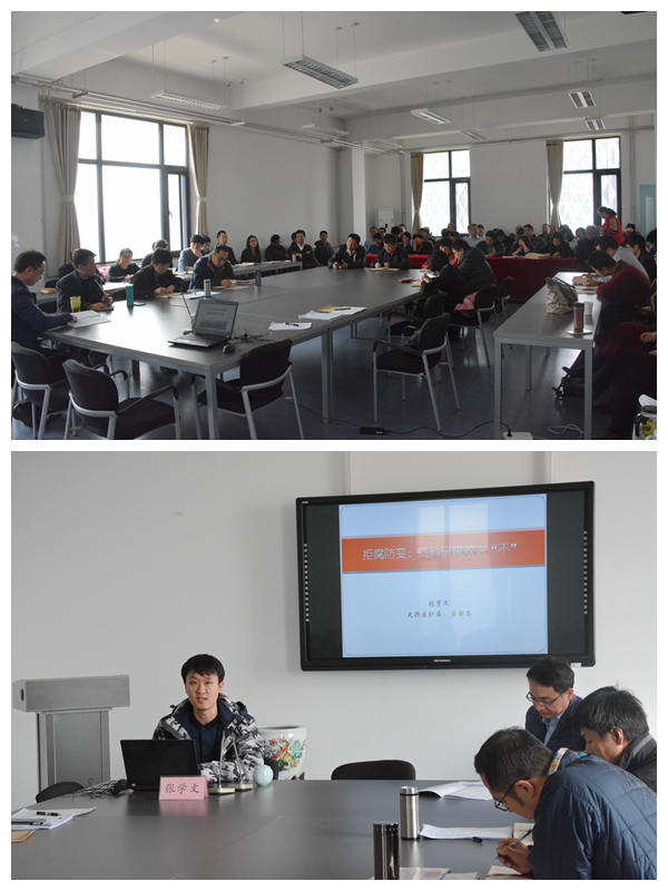 为加强党内政治生活监督,严明政治纪律和政治规矩,积极落实党风廉政建设主体责任,推动反腐败工作向纵深发展,太阳成集团tyc7111cc于3月13日下午在学E438召开党风廉政建设专题辅导报告会,邀请大兴区纪委监察委干部张学文同志就高校廉政建设、反腐败等问题做专项辅导报告。会议由学院党委书记冯宏岳主持,全院教职工集体参加。