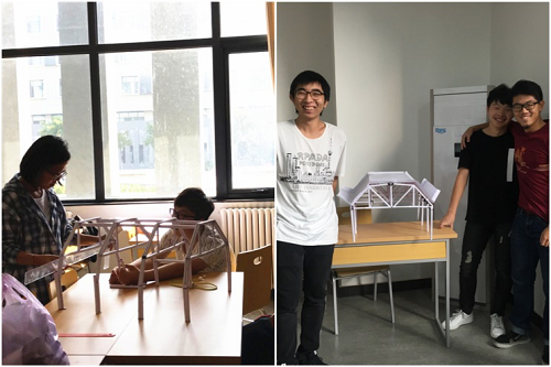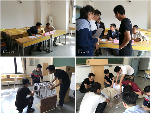在比赛过程中,指导老师对不同的模型进行点评,并指出需要进一步改进和加固的地方。五个参赛队伍齐心协力,精诚合作,遇到困难时,大家群策群力,克服加载过程中的难题,圆满完成竞赛各个环节。经过7个小时的激烈角逐,最终评选出郑思思等三名同学组成的“瓦特”团队和特尼格尔等三名同学组成的“矩阵位移”团队参加全国竞赛。