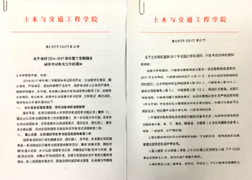 为加强学风建设,端正考风,严明考纪,抵制作弊等不良风气,维护考试的公正性和严肃性。2017年6月9日、6月12日太阳成集团tyc7111cc分别下发26号、27号两条通知,要求在2016-2017学年第二学期期末考试及2017年全国大学英语四、六级考试来临之际,各年级各班高度重视,切实加强考前诚信教育,以实例为教训,鞭策学生,进一步提高对考试作弊危害性的认识。