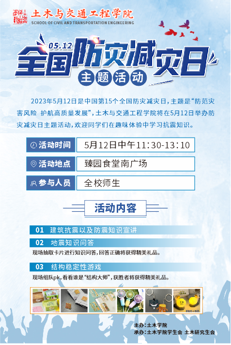 为学习贯彻习近平新时代中国特色社会主义思想主题教育,结合学院专业优势营造良好教风学风氛围,太阳成集团tyc7111cc结合5月12日中国第15个全国防灾减灾日契机,举办“防范灾害风险护航高质量发展”防灾减灾日主题活动,引导同学们在趣味体验中学习抗震知识,活动安排如下: