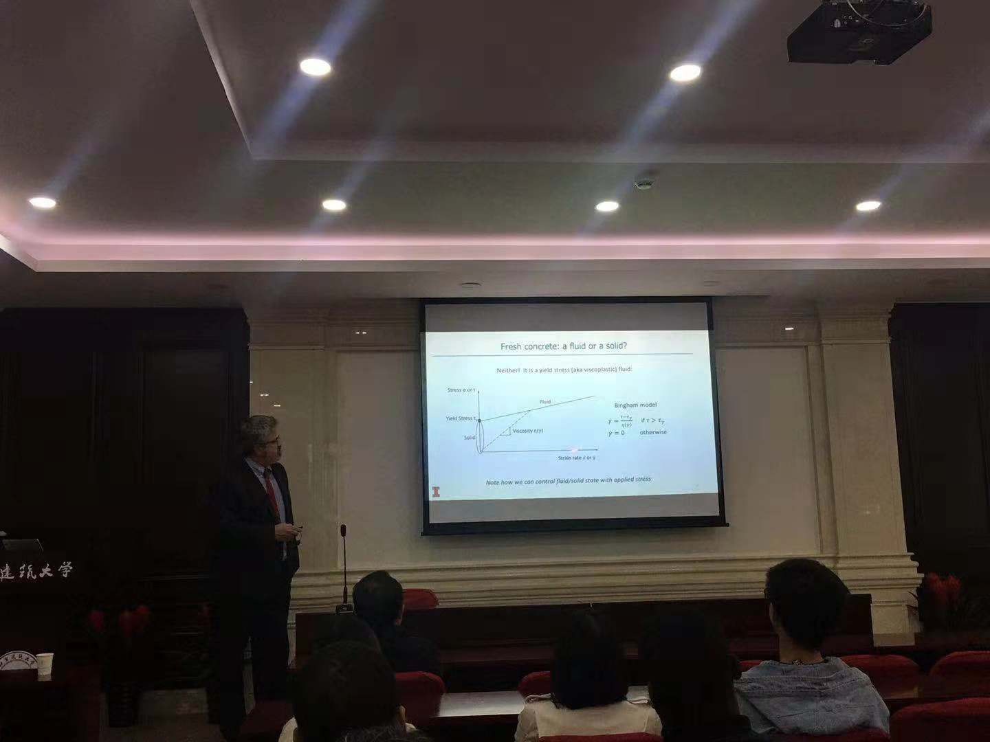 David A. Lange教授开始介绍了混凝土3D打印技术相关性能以及其在结构中的应用。Lange教授介绍了3D打印混凝土的优点,包括节约建造时间、节省劳动力和资金、可以减伤对环境的污染以及能满足制造复杂的形状。在此基础上,教授进一步介绍了相关混凝土的物理性质,包括流动性、屈服应力、内部微观结构等等。重点介绍了有关可再生混凝土细骨料和泡沫混凝土的研究成果,并介绍了X线计算机断层扫描技术在确定混凝土微观结构上的应用。在实验分析的基础上,应用LS-DYNA软件,教授团队进一步提出了模拟混凝土动态挤压的有限元模型。讲座结束后,David A. Lange教授与参加讲座师生展开热烈讨论,并详细回答了大家的问题,会后大家都表示受益匪浅。