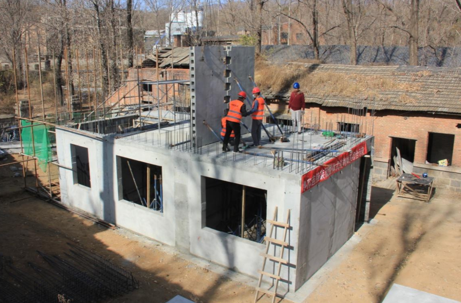 示范楼位于产研基地二期用地地块,原为老三线工厂。在示范楼施工现场,专家们冒着山里的寒风,观看了榫卯剪力墙的吊装过程。施工人员吊装了二层榫卯板标准板、带洞口板等典型构件,安装了墙体间竖向接缝、边缘构件钢筋等。榫卯板侧面不出筋,层间竖向连接钢筋伸入榫卯板的竖向孔内锚固,吊装快捷,一个预制板10分钟左右即可就位,墙体间竖向接缝钢筋就位时间约为3分钟(不包括绑扎过程),L形边缘构件处水平连接钢筋就位时间约为10分钟。