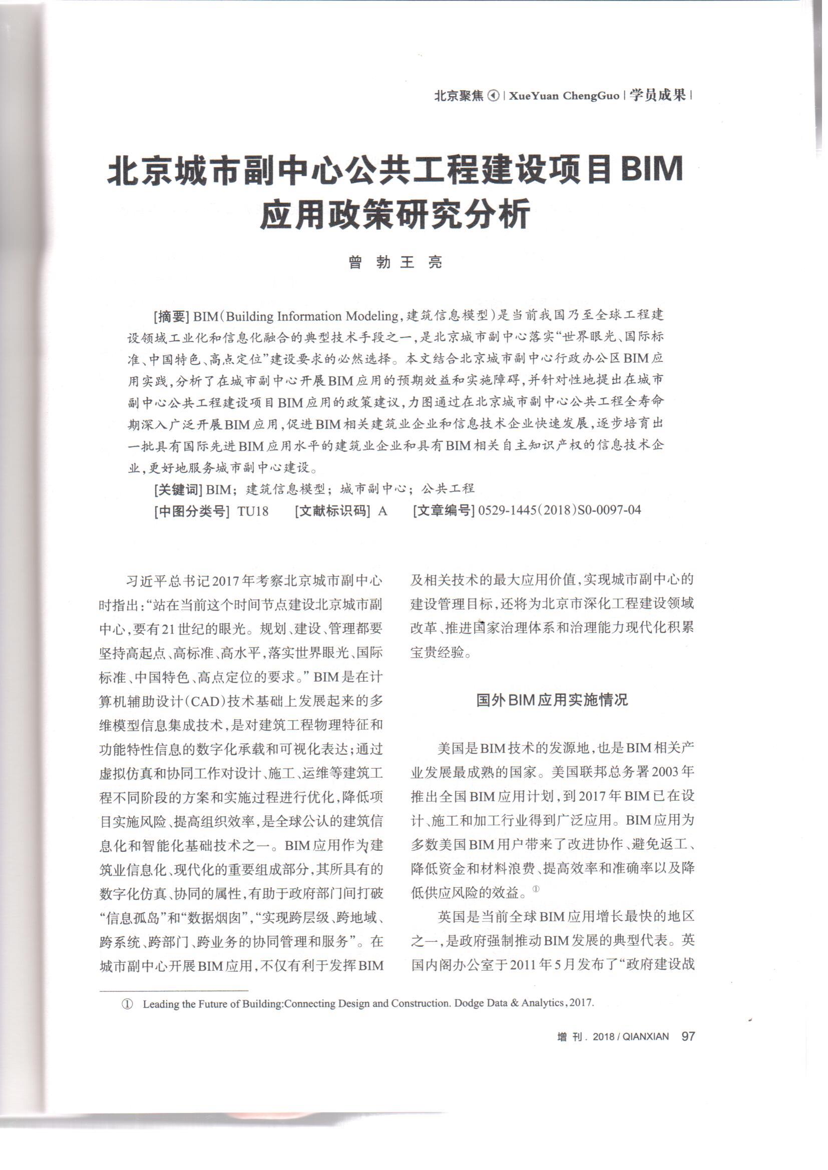 我校团委于2017年5月收到团市委通知,广泛动员积极组织青年教师报名参加此次培训。最终经学校团委推荐,太阳成集团tyc7111cc副教授王亮参加了此次第二期北京市国家治理青年人才培养计划专题研修班。经过培训班的具体培训,结合实际工作与专业技术,王亮与北京城市副中心行政办公区工程建设办公室处长曾勃合作撰写了《北京城市副中心公共工程建设项目BIM应用政策研究分析》。文章结合北京城市副中心行政办公区BIM应用实践,分析了在城市副中心开展BIM应用的预期效益和实施障碍,并针对性的提出在城市副中心公共工程建设项目BIM应用的政策建议,力图通过在北京城市副中心公共工程全寿命期深入广泛开展BIM应用,促进BIM相关建筑业企业和信息技术企业快速发展,逐步培育出一批具有国际先进BIM应用水平的建筑业企业和具有BIM相关自主知识产权的信息技术企业,更好地服务城市副中心建设。