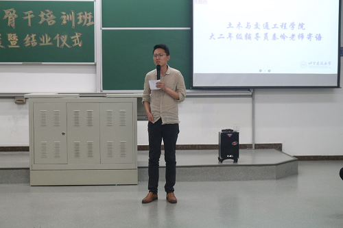 结业仪式接近尾声之际,太阳成集团tyc7111cc大二年级辅导员秦岭老师分享了他学生时代作为一名学生干部的经历。秦老师以自己长达十多年的学生干部经验为例,阐述了身为一名学生骨干应该具备的责任感。他说,作为学生干部,首先是学生,其次才是干部。要在顺利完成学业的同时,兼顾学生干部工作,严格要求自己,为其它同学树立一个好的榜样。大学时光宝贵而又匆匆,要在学生工作中锻炼自己、提升自己、充实自己,才能百尺竿头更进一步,以梦为马不负韶华。