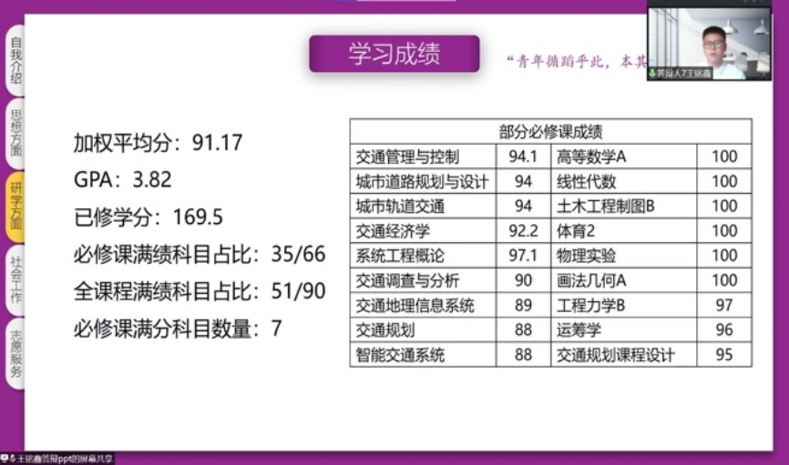 答辩过程中,每名答辩候选人结合本人大学期间的求学经历,分别从学习成绩、获奖情况、校内社会工作、实践志愿公益、课外科技活动和竞赛、文体活动和特长、发表论文和专利专著等方面进行了精彩阐述,大家用铿锵有力的答辩和青春激昂的风采诠释了新时代青年学生的积极态度,彰显土木学子德智体美劳全面发展。答辩结束后,学院领导和老师对8位同学答辩结果进行现场评分排名。