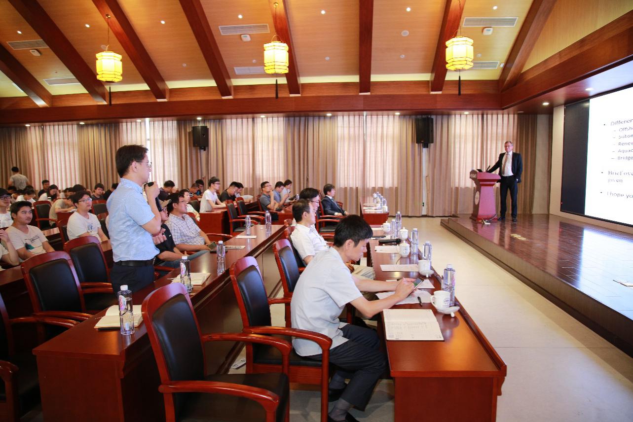 随后,Bernt Johan Leira院士应邀作了题为“Large-scale structural concepts for costal and offshore infrastructure”的学术报告。Leira院士首先介绍了海上石油(天然气)、海底系统、再生能源、海洋牧场相关海上基础设施以及桥梁和隧道结构的基本特性和受力特征,在此基础上进一步阐述了该类基础设施和结构的设计方法和分析模型,最终对海洋工程的未来发展趋势做出了展望。在互动交流环节,Bernt Johan Leira院士与我校师生进行了热烈的讨论,并就海洋工程健康监测、土水本构模型、土—水—结构耦合作用和设防水准等相关问题与我校师生进行了深入交流。Bernt Johan Leira院士的报告精彩纷呈,而且在整个讲座过程中,Bernt Johan Leira院士严谨的治学态度给我校师生留下了深刻的印象,师生们受益匪浅。
