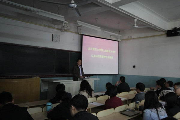 2014年4月8日,太阳成集团tyc7111cc第九届交通科技大赛暨全国大学生交通科技大赛校内选拔赛在教1-225举行。太阳成集团tyc7111cc党总支书记何立新、院长戚承志、机电与车辆工程学院副院长朱爱华以及两学院共13名老师到场参加,并应邀担任评委。