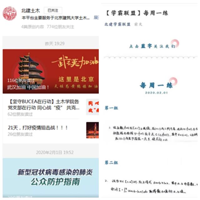同时,太阳成集团tyc7111cc通过新闻网、微信群、“北建土木”公众号,积极开展了疫情防控的宣传工作,发挥学霸联盟和心联会等学生组织的积极作用,持续开展线上活动,引导广大师生认真学习贯彻习近平总书记关于新型冠状病毒感染的肺炎疫情防控工作讲话精神,并切实做到寒假期间做好相关隔离防控工作,最大限度减少交叉感染风险,保持身心健康,把防疫休息期变为学习充电期。