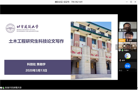 焦驰宇副教授从研究生求学初衷、论文分类、写作技巧等几个方面进行讲解。一是研究生该做什么?他指出研究生应该秉持自主、创新的科研态度,在投身科研的过程中注重培养科学研究能力、工程实践能力、自我管理能力、语言表达能力和团结协作能力。二是发表论文的目的。他通过分享亲身科研经历指出论文发表是科研工作的最佳反映,通过学习、批判、提升和创新实现科研过程,理论联系实际,推动土木行业发展。三是对学术性论文、技术性论文和学位论文进行分类介绍。焦老师还分享了土木行业多个高水平期刊的投稿流程和特点。四是论文写作技巧。他强调,论文写作要保证其科学性、创造性、理论性和平易性,并就论文结构、文献综述管理、摘要撰写、发表流程等方面进行详细介绍。