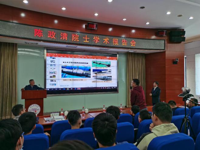 最后,陈政清院士在学院楼E座报告厅为学校师生作了题为“悬索桥多阶涡振及其防治”的学术报告。报告会采用线上线下相结合的方式,全校师生共300余人参加。报告会由李爱群副校长主持。