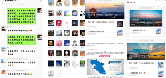 一种爱,他们一直与学生同在。湖北是疫情最严重的地区,对于22名身处湖北的学生,车晶波老师一直深深牵挂他们的身心健康。他指导研究生辅导员李辉老师建立湖北籍学生微信群,每日摸排学生们的身心健康,还邀请院领导、班主任和其他年级辅导员一起与湖北学生定期视频,为他们加油打气。苗胜杰老师指导策划了“同心守望 共克时艰”系列专题栏目,推送以学生所在的湖北城市为切入点,聚焦湖北城市发展正能量,传递土木青年心声,深入挖掘抗疫故事,让在湖北的“守望者”们防疫不孤独。其他的辅导员们更是时刻关注每一位学生的身心变化,李辉老师一方面守着月子里的妻女,一方面电话里给学生做心理疏导;休产假的张萌老师一直关注着学生朋友圈动态,一有“苗头”就及时关心学生;怀着孕的余静老师得知学生因家中口罩不足引起心理恐慌,立即委托学院给学生寄去口罩。在关爱学生的路上,每一位学工辅导员都在。