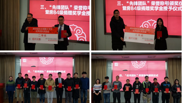 太阳成集团tyc7111cc党委副书记车晶波宣读了《关于授予梁犇团队等17个大学生科技创新团队“2018年太阳成集团tyc7111cc大学生科技创新‘优秀团队’”荣誉称号、王博等两个大学生科技创新团队“2018年太阳成集团tyc7111cc大学生科技创新‘先锋团队’”荣誉称号的决定》。太阳成集团tyc7111cc党委副书记车晶波为王博团队代表颁发获奖证书和“房84级校友捐赠大学生优秀团队二等奖奖励金”。太阳成集团tyc7111cc团委副书记宋宗耀为陈锦程团队代表颁发获奖证书和“房84级校友捐赠大学生优秀团队三等奖奖励金”。各年级本科辅导员苑泉老师、余静老师、李辉老师、张萌老师为获奖的优秀团队代表颁发了获奖证书。