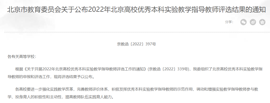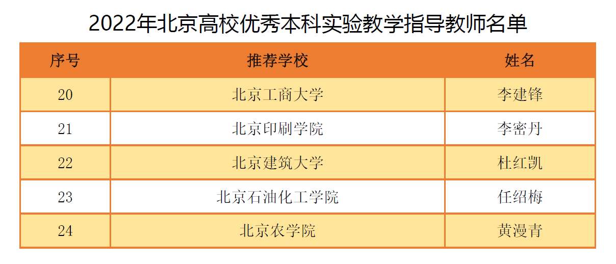 今年首次设立的“北京高校优秀本科实验教学指导教师”,是北京市教委落实《北京市“十四五”时期教育改革和发展规划(2021—2025年)》和《北京高等教育本科人才培养质量提升行动计划(2022—2024年)》(京教高〔2021〕8号),强化实践教学改革,完善教师评价体系,提高教师队伍实践育人能力的重要举措。2022年8月,市教委组织开展2022年“北京高校优秀本科实验教学指导教师”的申报和评选工作,经北京地区各高校自主申报、市教委审定并公示后,最终遴选出31位“北京高校优秀本科实验教学指导教师”。