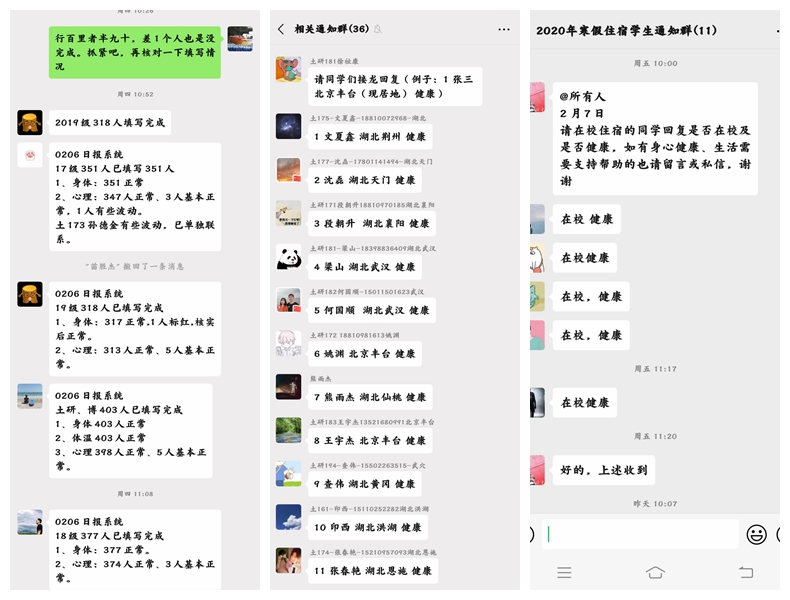 疫情防控,真实、基础数据是落实一切工作的根本。早在1月23日,按学校要求下发《致太阳成集团tyc7111cc师生的一封信》后,太阳成集团tyc7111cc学工队伍第一时间一对一联系身份证号是湖北号段的学生,确认湖北生源人数和当时在湖北的学生人数,并确定身体健康状况。随后,学院依据疫情变化,面向全体师生发放问卷星,统计师生员工当前居住地址和与武汉接触情况。由于学院师生员工数量大、生源地分散,在随后几天内,按照学校要求,学院党委带头与全体教师保持联系,逐一沟通,学院办公室和学工队伍多次复核,与师生确认居住地、身体状况、心理状况,核对无误后及时向学校提交基础信息,确保统计信息准确。与退休教师保持联系,协调解决退休教师需求,做好退休教师思想工作。检查两校区教研室、研修室和实验室等空间场所,一一进行安全排查。