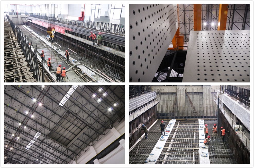 该工程目前正在进行振动台阵基础的一期混凝土浇筑工作。从11月5日~8日,在50余小时时间里将连续浇筑2500余方混凝土。在参观过程中,老师向同学们介绍了实验室的相关建设细节:实验室振动台阵基础建设采用桩基础,共打下300余根的混凝土桩固结在基岩之上;该工程使用的主要建筑材料为C40混凝土、钢筋和型钢预埋件,为了避免大量水化热引起的混凝土膨胀裂缝,减少了水泥的掺量,用粉煤灰和矿粉替代。为保障工程的质量和振动台阵技术指标的先进性,要求导轨在制造误差上控制在±0.1mm内,安装误差为±1mm。