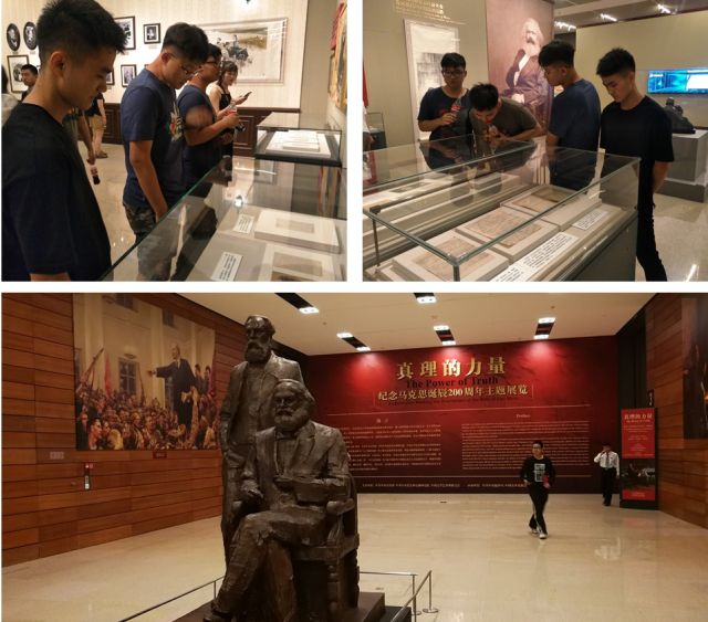 位于博物馆南馆的“真理的力量——纪念马克思诞辰200周年主题展览”是我们此行的主要目的地。该展展出马克思、恩格斯、列宁手稿、笔记本及亲笔签名的原版书籍等珍贵文献100余件,原版图书、图片、马克思主义题材美术作品、雕塑作品等展品,展示了马克思的生平、革命实践、理论贡献和精神境界,展现了马克思主义在中国传播运用和丰富发展的光辉历程,供我们学习。伴随着展馆中《国际歌》的雄伟壮阔,大家更是心潮澎湃。各党员师生对于党史有了更深刻了解,积极分子们也对于党组织有了全新的认识和由衷的向往。