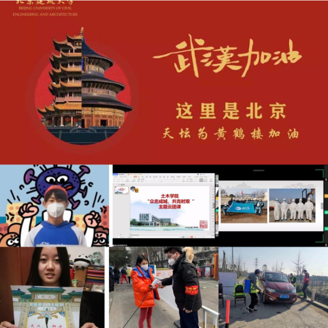 学院40个团支部积极响应,每日按时完成“一对一通联工作”和班级团日活动。学生们同心同力积极地为武汉等地加油,活动中共收集加油视频123个,音频187支,加油手幅照片621张,收集成果陆续发布在北建土木微信平台上(共15期)。其中15名学生毅然参与到社区志愿服务工作当中,3名学生响应团市委号召无偿献血,1名现役大学生士兵奔赴前线,1名学生为学院捐助600支口罩。学院将他们无私奉献的榜样事迹汇总推送,在北建土木微信平台上发表,为同学们树立榜样。