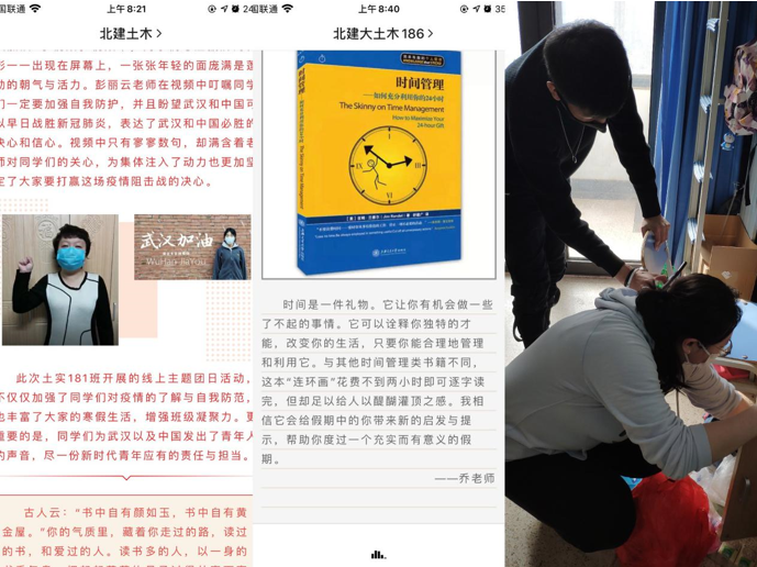 二是发挥学业学风引领,疫情的发生,不能阻挡学习的热情。学院通过班主任、研究生导师、辅导员共同编织的“关爱网”了解学生在线上课学习需求,共为151名本科生和硕士生寄、送学习物资,保障学生在线顺利进行。同时也为76名学生寄送了口罩等防疫物资,保证学生的安全。学院号召同学利用阻击疫情期间借助网络资源参与“读一本好书、看一集网络课程”活动。学院15名班主任、4名辅导员与363名同学一同参与到“读一本好书”阅读分享活动中,将假期中的读书体会发布在北建土木微信平台上(共7期)。这些偶然邂逅的薄纸短字,在思想的峰峦与现实的平地之间,构建起我们的精神所在,给予大家前进的力量。