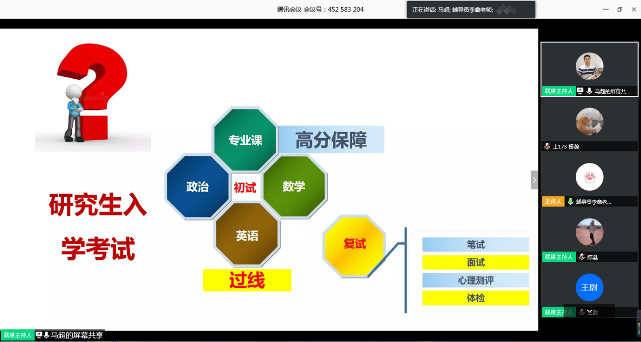 首先,马超老师为同学们讲述了考研的大致流程和科目,并说道考研可以提高自己的专业知识与科研能力,有利于将来的就业,而且还可以通过考研重新定位个人的专业和学校。同时,提醒同学们要根据自己的实力来选择目标学校,通过学校的官网,查找招生简章和相关导师的信息,初步了解初试和复试的科目。在提问环节,向大家阐述了学术型硕士与专业硕士的区别,帮助同学们选择一条更适合自己的道路。