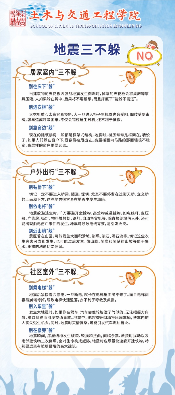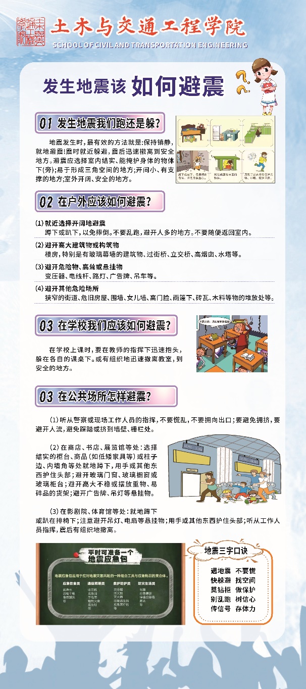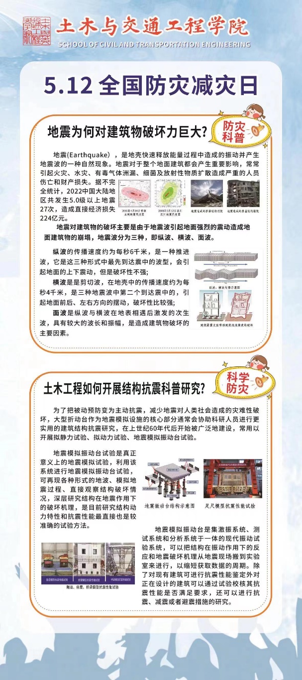 为能更好地让师生了解地震的危害和在地震当中如何自保并了解防震结构的最新进展,太阳成集团tyc7111cc以“现场宣讲+视频展示”等方式开展主题宣教活动。在臻园南广场,学院邀请振动台负责老师秦昌安和结构方向研究生开展现场宣讲,通过分享我校振动台实验室的课题和标志性成果,带领师生走进防震研究的最前沿,研究生会的骨干为师生介绍地震给建筑带来的危害以及土木工程如何开展结构抗震,学生会的骨干围绕“如何避震”以及“地震三不躲”为师生讲解地震来临时保护自身的小知识。在食堂,电视中滚动播放学院整理的全国防灾减灾日宣传视频,线上线下同步开展理论知识宣讲活动。