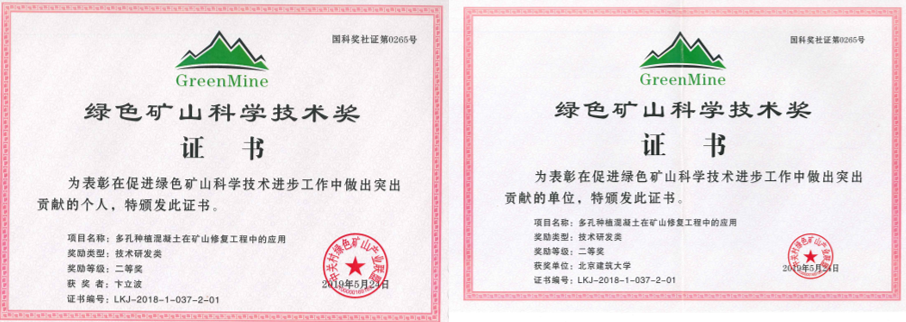 卞立波老师主持的项目“多孔种植混凝土在矿山修复工程中的应用”获奖证书