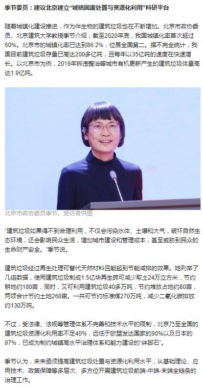 在接受新京报记者关于垃圾分类问题采访时,季节教授列举了几组建筑垃圾综合治理相关的数据。她认为,未来亟须提高建筑垃圾处置与资源化利用水平,从基础理论、应用技术、政策保障等多层次、多方位开展建筑垃圾前端-中端-末端全链条的治理工作。她建议,北京应率先建立“城镇固废处置与资源化利用”科研大平台,填补领域空白。可采用逆向物流、人工智能等多途径方法交叉运用,系统研究建筑工程评价、规划设计、绿色施工、建筑垃圾分类处置、资源化利用、环境评估与控制、监测与精准管控等绿色关键技术,并借助管理政策研究将技术嵌入整个城市治理体系,为北京市乃至全国建筑垃圾处置与资源化利用工作提供技术支撑。