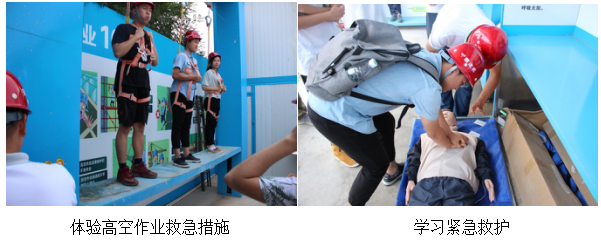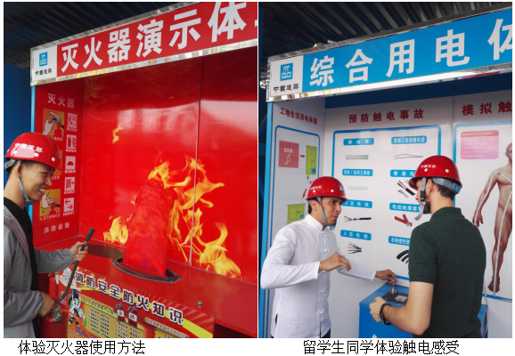 首先,在解说人员的带领下,同学们参观了智慧施工—物联网系统。利用互联网+思维,在施工现场安装空气质量、施工安全等监控系统,通过算法可以在手机上进行数据实时反馈,把控工程质量、保障施工安全、提升作业环境。随后,在安全教育培训区,同学亲身体验了灭火器演示、综合用电体验、模拟紧急救护等施工现场突发情况的模拟处理设施。