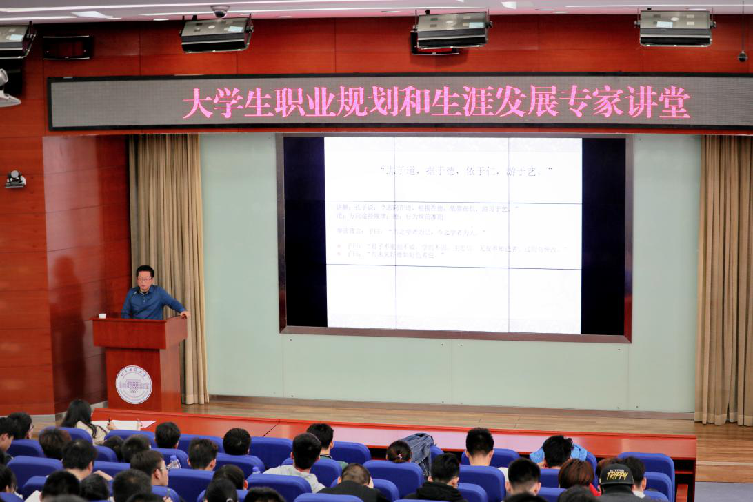 程波浪在讲堂中结合自身生涯发展经历,公司的发展情况、企业运营情况和企业用人情况进行介绍,从企业的角度分析当前行业对专业人才的基本要求,促进学生树立积极正确的就业观。他在讲座中贯穿使用《论语》为同学们阐述了如何进行大学生的职业规划。从“择业”角度,希望同学们要具备自己的价值体系,分清楚现实与理想,选择自己感兴趣的职业;从“好学”角度,提醒同学们不断充实自己,做好根基准备,待到机会来临时,充分发挥实力把握住机遇;从“敬业”角度,告诫同学们“态度决定一切”,对一份职业的诚心尽力往往比技能更加重要;从“乐艺”角度,鼓励同培养业余兴趣爱好,所谓“腹有诗书气自华”正是如此。程波浪语言诙谐幽默,更像是学生的知心老朋友,现场气氛十分热烈,通俗易懂的表现形式深受学生们的喜爱。