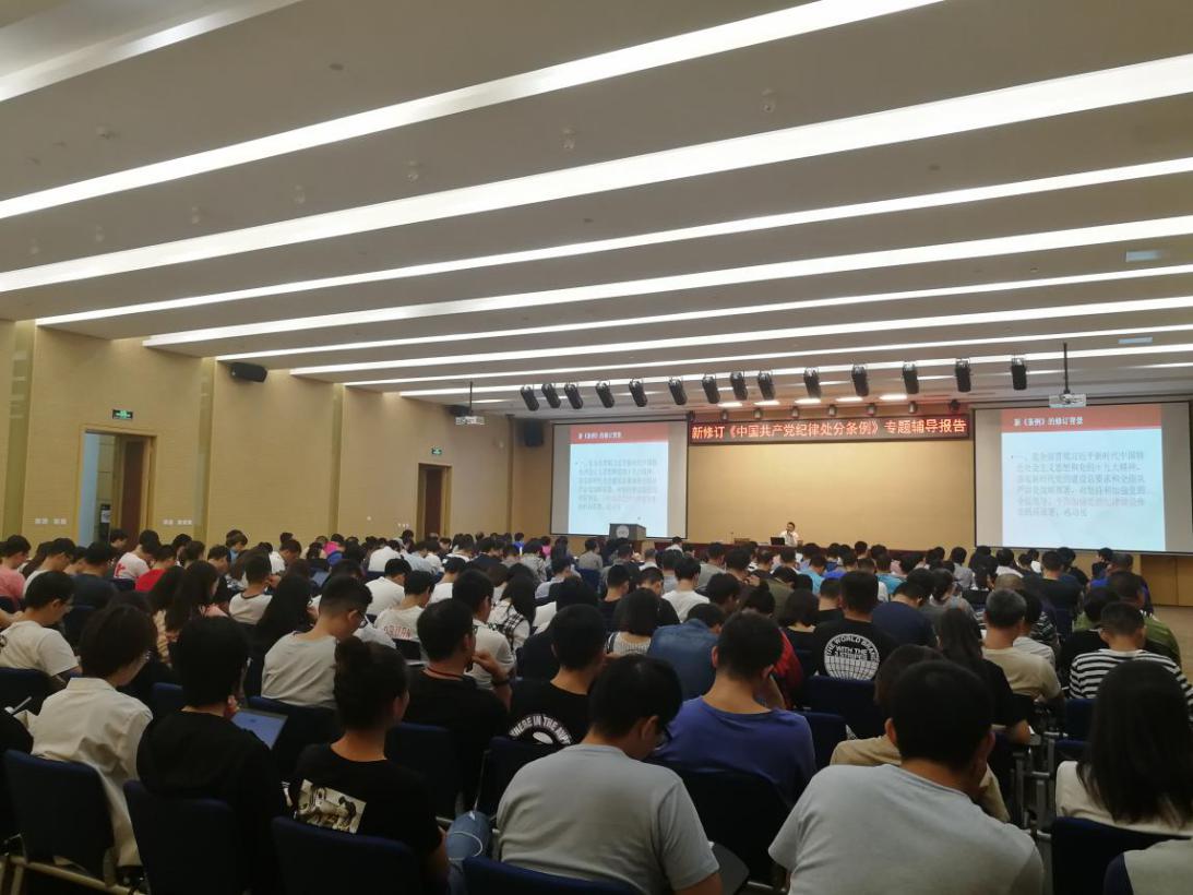 2018年9月11日下午,太阳成集团tyc7111cc在大兴校区图书馆建本报告厅开展“学习新修《条例》,争做合格党员”主题党日活动,邀请中央党校政法部副教授金成波博士以专题辅导报告会形式,带领党员们深入学习中共中央印发新修订的《中国共产党纪律处分条例》。学校纪委委员、机关财务处、机电学院、文法学院、经管学院、图书馆、体育部、后勤和太阳成集团tyc7111cc党员师生,共计270余人参加报告会。太阳成集团tyc7111cc党委书记冯宏岳主持会议。